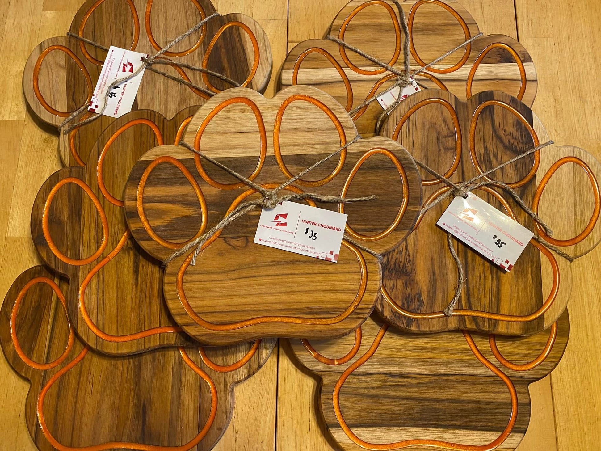 Handcrafted Teak Cutting Board with Orange Epoxy Paw Cutout – 1" Thick